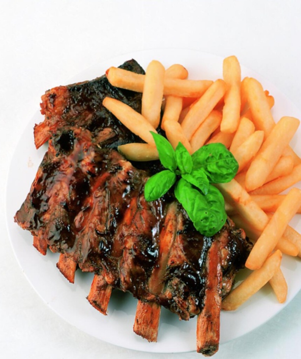 Tender, fall-off-the-bone pork ribs marinated in our smoky house BBQ sauce, flame-grilled to perfection and served with a generous portion of golden, crispy chips.